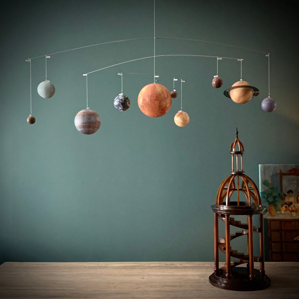 This Solar System Mobile includes miniature planets that represent our planetary system. Gazing at the night sky we wonder about the size and scope of the universe. Within that magnitude our solar system seems infinite and overwhelming. It’s easier to understand Newtonian and Galilean theories when viewing the solar system on a smaller, more comprehensible human scale. Reduced to both scientific and decorative models of our solar system, revolving around the sun and not the earth as early scientists believed, this mobile will fascinate the young in age and the youthful in heart.