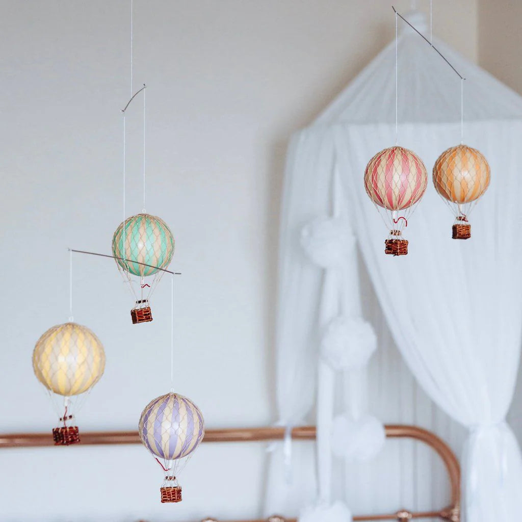 Virkilega fallegur órói sem skartar fimm loftbelgum í pastellitum. Óróinn er tilvalinn í barnaherbergið eða sem skrautmunur í önnur rými heimilisins.