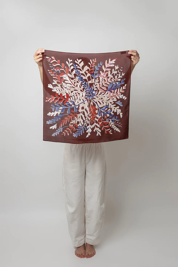 Purple, rustic red and pink print on a brown background. Good size for a neck scarf.
