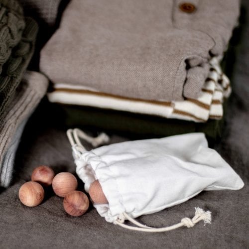Balls of Red Cedar wood whose scents will refresh your closet and dressing room. Placing red cedars in the closet is an old housewife cleaning tip – the fragrance works as a natural pest repellent. The balls can be spread out in the closet but be sure not to put them directly on your clothes when the wood may leave grease stains. When the scent wears off you can sand lightly with fine sandpaper.