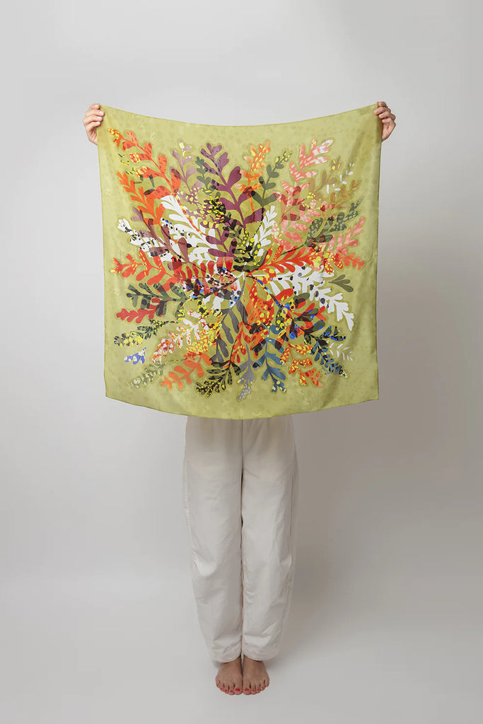 Multicoloured print on a lime green background. Can be worn around the neck or as a headscarf. Digital print based on ink drawings of plants found in the Icelandic flora.