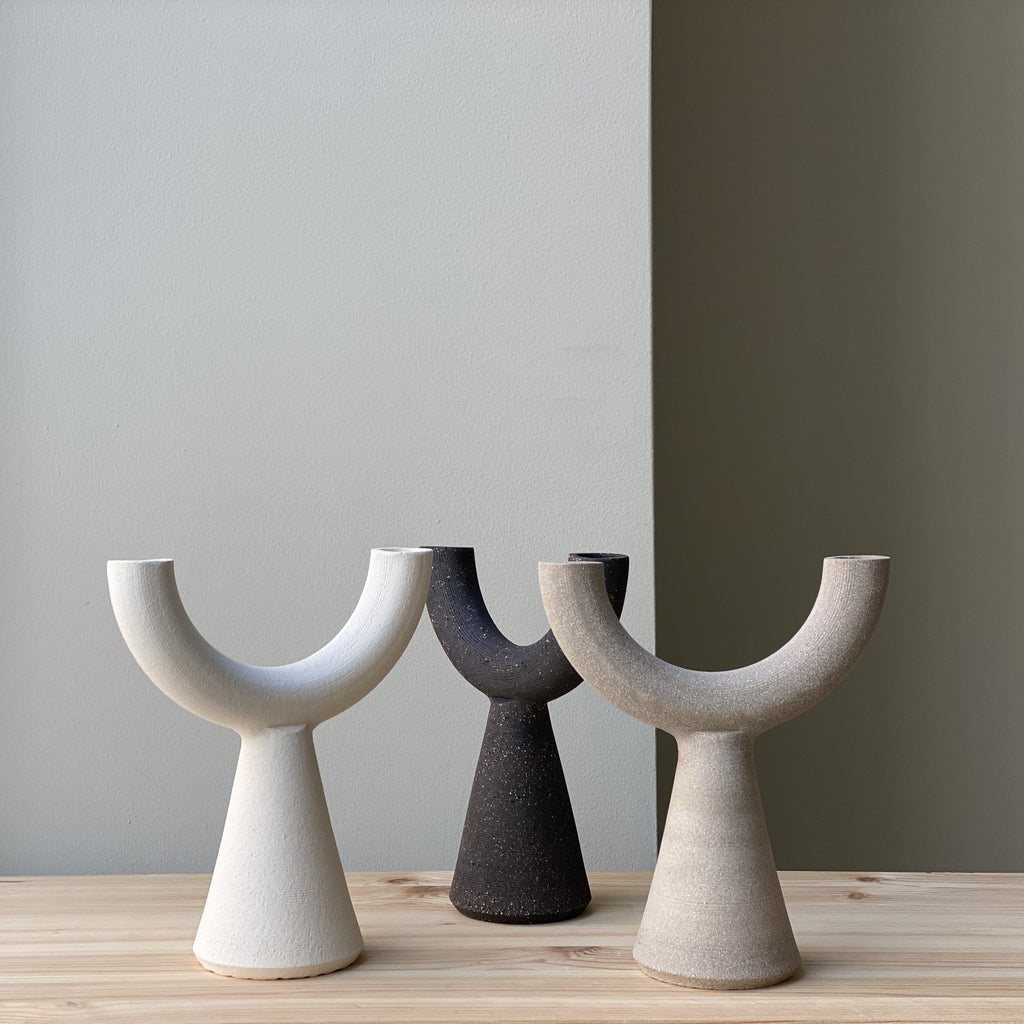 Minimalist candelabra in textured grey stoneware for 2 standard candles. Hand-thrown on a potters’ wheel in Edinburgh.
